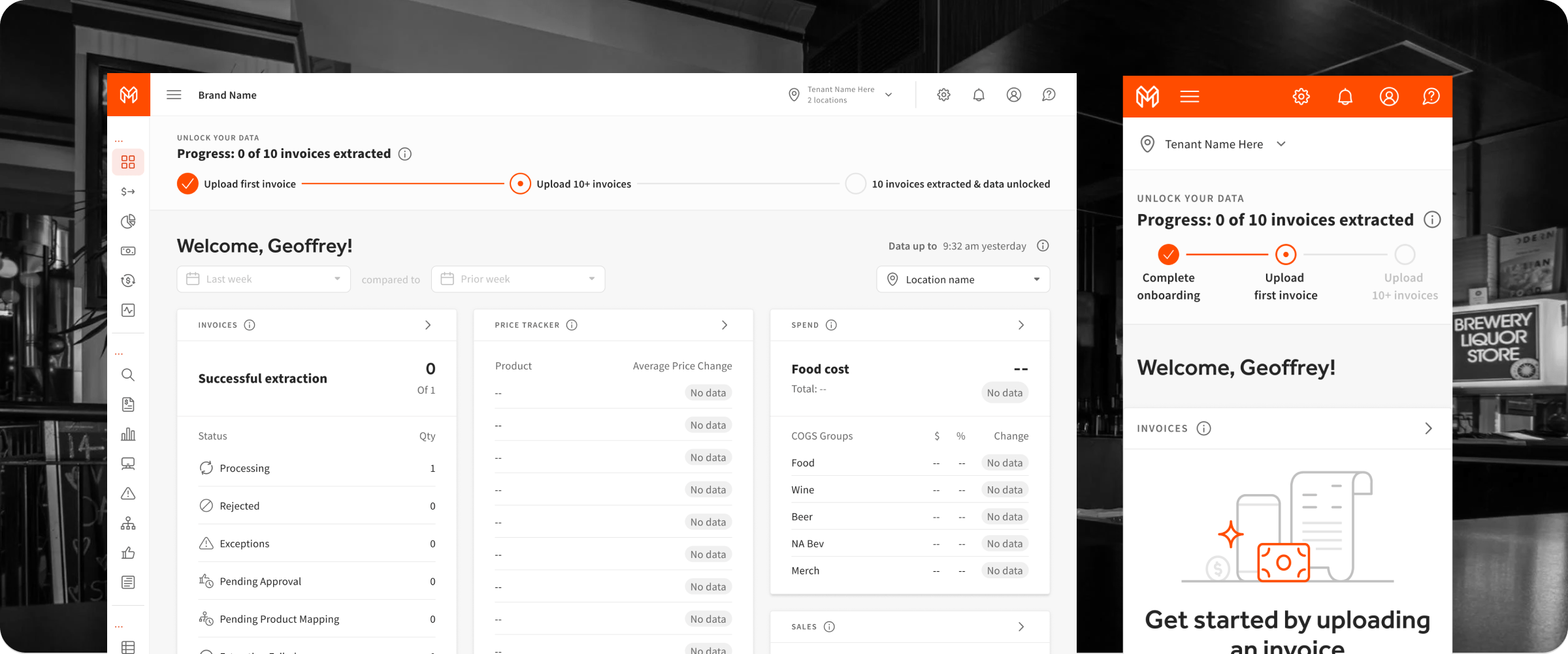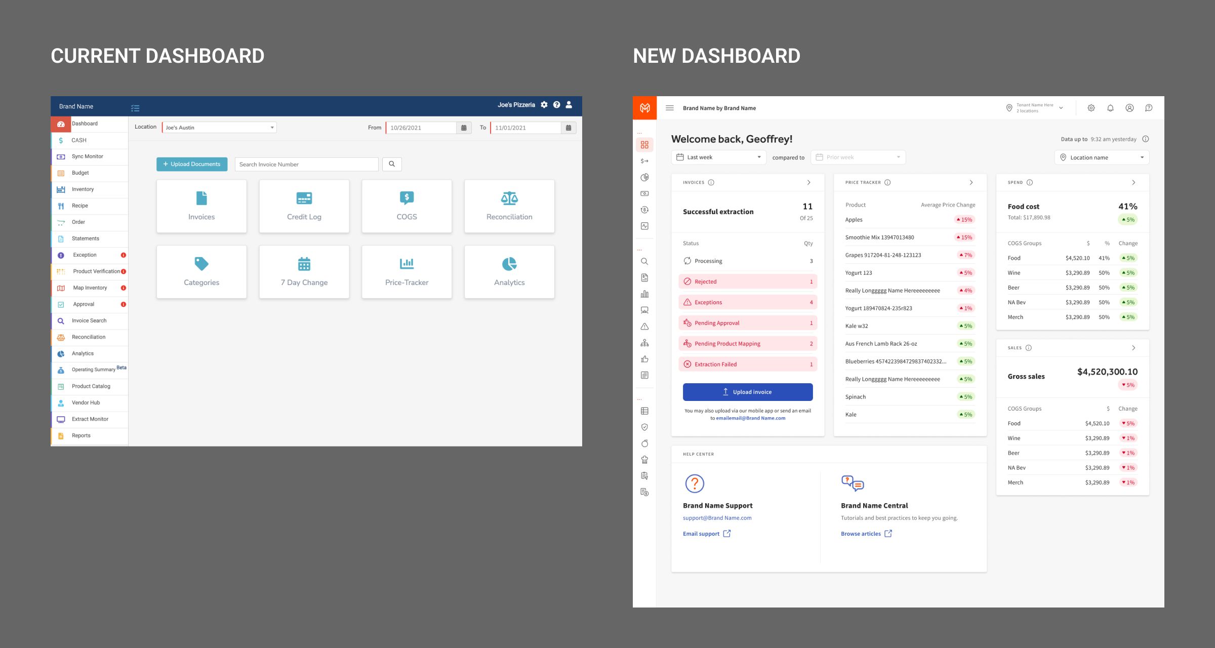 The new Dashboard shows the performance of key indicators from the previous period of time. The indicators are Revenue, Orders, and Food Cost/COGS as well as Invoices from Products. This dashboard also has helpful links and extra filters that can be used to get more information.